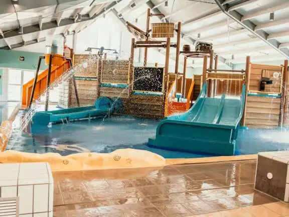 In het overdekte zwembad kun je baantjes trekken of gewoon vrij zwemmen. Achter het zwembad – dat 10 bij 15 meter groot is en een diepte heeft van 1,39 meter – ontdek je het indrukwekkende waterspeelschip dat garant staat voor urenlang speelplezier voor de kinderen, of de gloednieuwe wildwaterbaan.